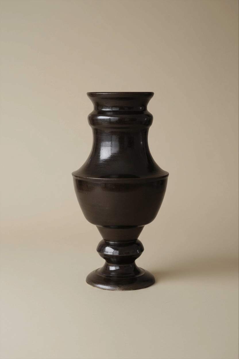 The vase embodies a quiet elegance. Its deep, rich dark brown glaze creates a warm, contemplative presence, while the subtle irregularities and visible brushstrokes reveal the attentive hand behind its making. With gently flowing curves and a tactile surface, it invites touch and reflection, turning a simple object into a ritual of everyday beauty.