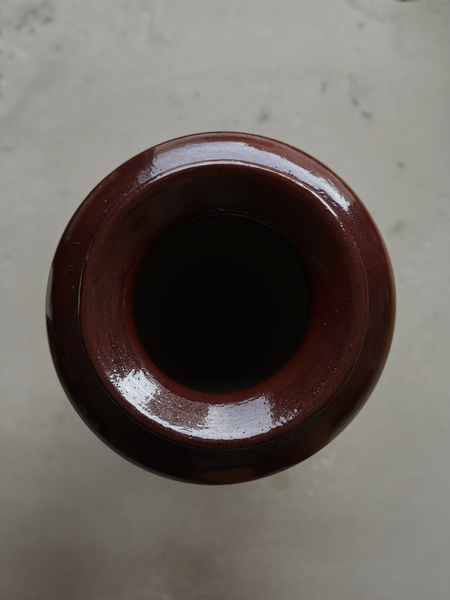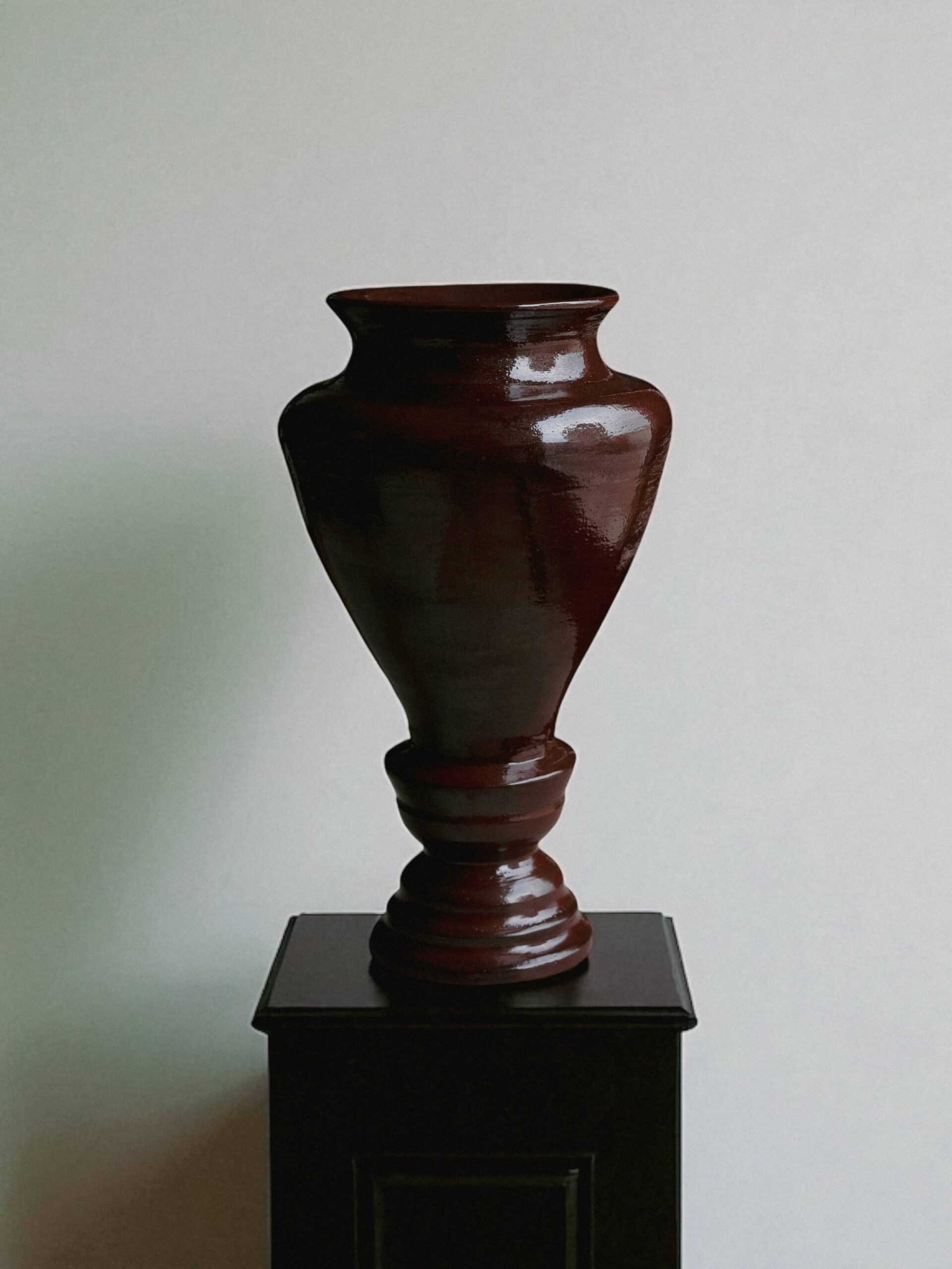 Hand-shaped in a rich, garnet-toned glaze, this ceramic vase features a sculptural silhouette with a strong, fluted base and gently curved shoulders. The surface carries a quiet sheen, reflective enough to catch the light in passing.