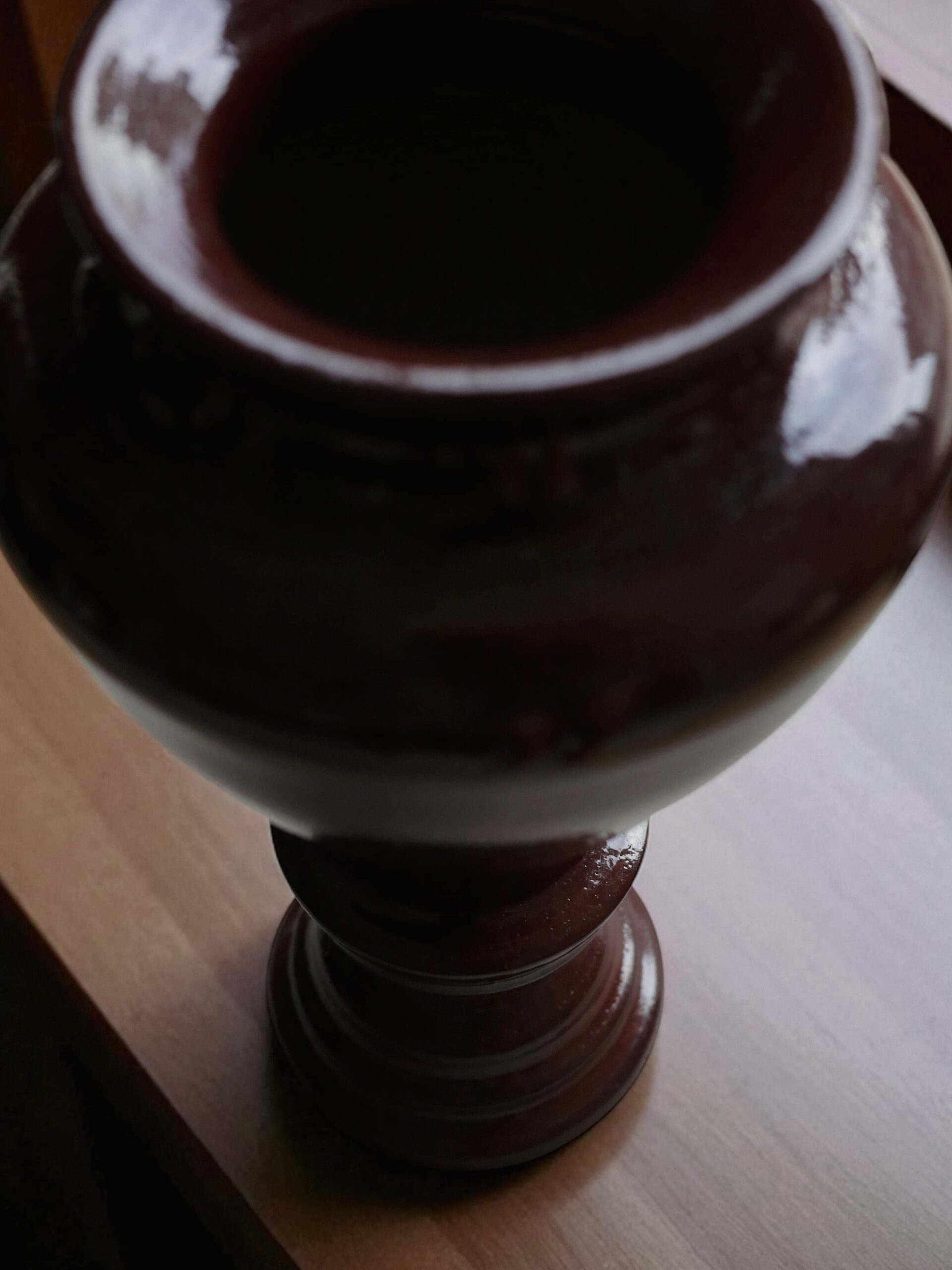 Its deep red hue recalls polished mahogany, ripened plum skin, or the stillness found in aged wood. Solid yet serene, it’s made to hold presence in a space – with or without flowers.