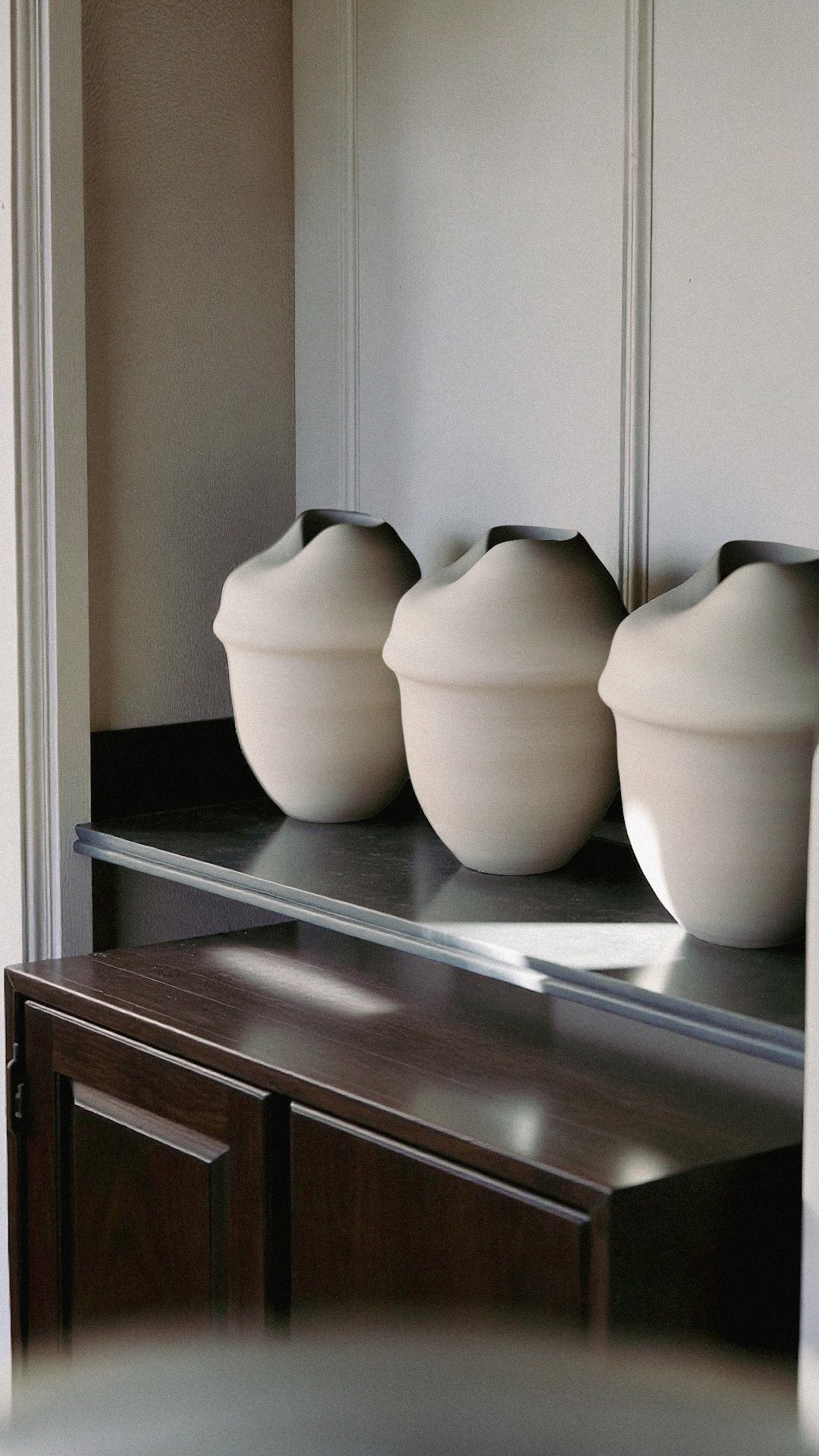 The vase’s surface is finished in a soft, matte surface, highlighted by delicate white-off hues. Though smooth to the touch, the exterior has a subtle, textured quality that echoes the fine grains of wind-swept dunes. This tactile detail adds an extra layer of depth and visual interest, enhancing the vase’s understated appeal.